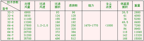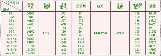 本系列共有 33 种规格,每室的袋有 32 、 64 、 96 、 128 袋四种, 滤袋长度有 2450mm 和 3060mm 两种,收尘效率高,净化后气体的含尘浓度小于 100mg/m3 (标)本系列收尘器如用于寒冷地区,当室外采暖计算温度≤ -25 ℃时,要设热装置。